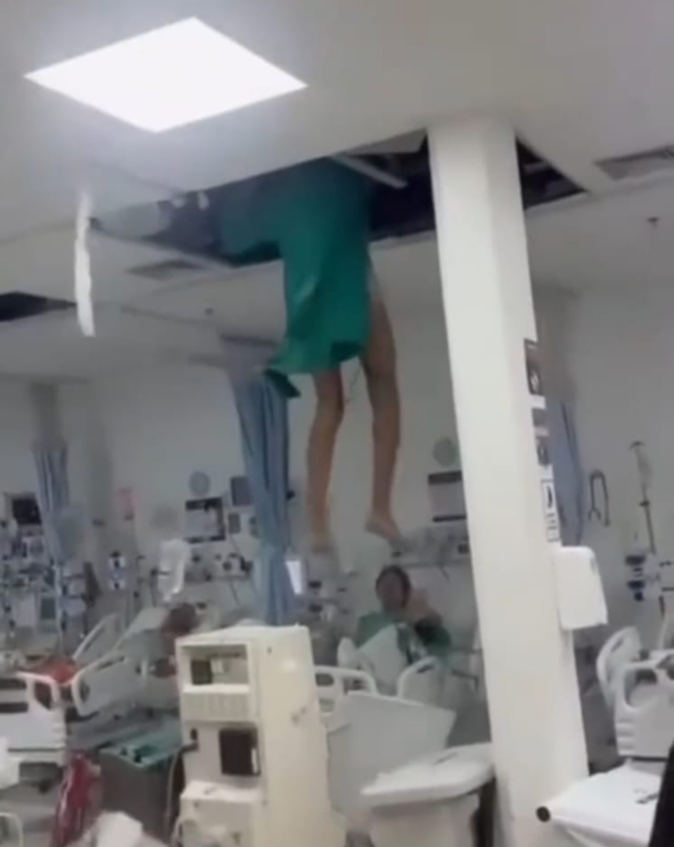 As imagens mostram o homem, vestindo roupas de paciente, derrubando o forro e despencando dentro da sala de internação. O teto cede em dois pontos e, ao cair, ele quase atinge outra mulher, que estava acamada no local.